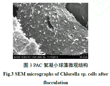 絮凝作用主要有電荷中和、架橋原理及卷掃絮凝等,絮凝可能是其中一種起作用也可能是兩種或更多相互作用。圖3是PAC絮凝小球藻的電鏡掃描圖,從圖中可以看到小球藻鑲嵌在PAC中,使大量的藻細胞與PAC聚集成大的絮團,形成明顯的卷掃絮凝作用。PAC投入藻液后,其水解生產帶正電荷的氫氧化物,中和帶負電荷的藻細胞,相互吸附,在相應的碰撞下形成礬花。因此PAC絮凝微藻是電荷中和和卷掃絮凝共同作用的結果。